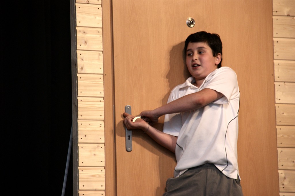 Gut, dass der Schulhausverwalter solch eine stabile Tür als Bühnendekoration gebaut hatte! Was musste sie nicht alles aushalten: leichtes Anklopfen, ungeduldiges Trommeln, leises Öffnen, gewaltiges Zuschlagen. Und wer alles durch sie vorwärts oder rückwärts hindurchging: einzelne Schüchterne, ein Mädchen, das eigentlich nur lesen wollte, ein anderes konnte durch Tränen andere vertreiben, Stühle wurden geklaut und wiedergeholt, eine Einradfahrerin, zum Mobbing entschlossene Jungen, kreischende Mädchen… Die Körpersprache sollte stärker als das Gesprochene sein, das sagte ihr Regisseur und die ganze Gruppe hat es hervorragend umgesetzt.