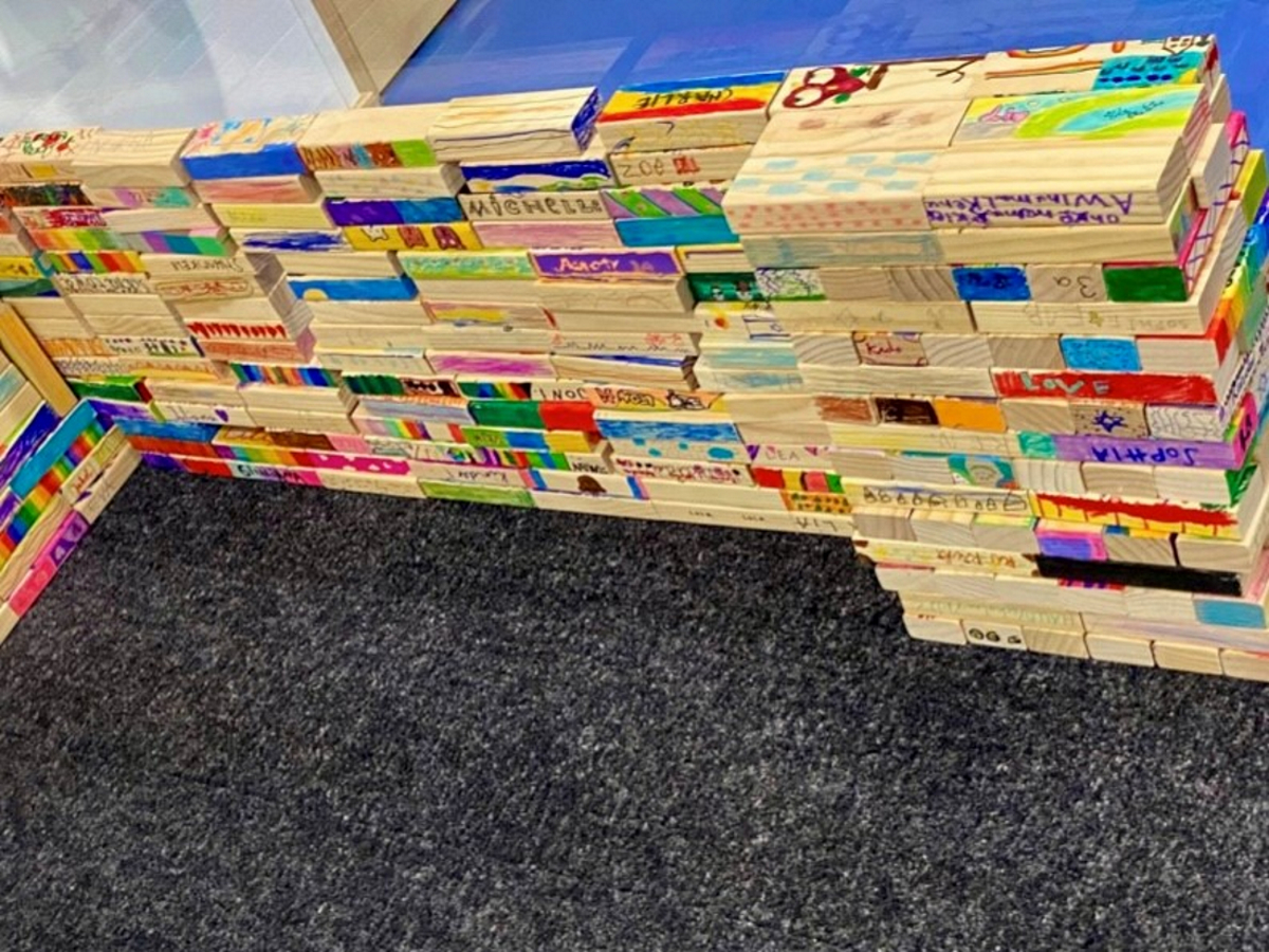 Die Kinder hatten viel Freude daran und entschieden, das Bauwerk so groß zu machen, dass sie selbst darin Platz finden könnten. Schnell stellten sie jedoch fest, dass die Mauern nicht stabil genug waren – und entwickelten daraufhin eigene Ideen, wie man die Steine anders anordnen könnte. So entstand eine Schutzwand und später sogar ein Turm, den Kinder unterschiedlicher Klassen am Ende des Schultages immer wieder neu aufbauten. Besonders begeistert waren sie, wenn sie dabei „ihren“ eigenen Baustein oder den eines Freundes entdeckten.